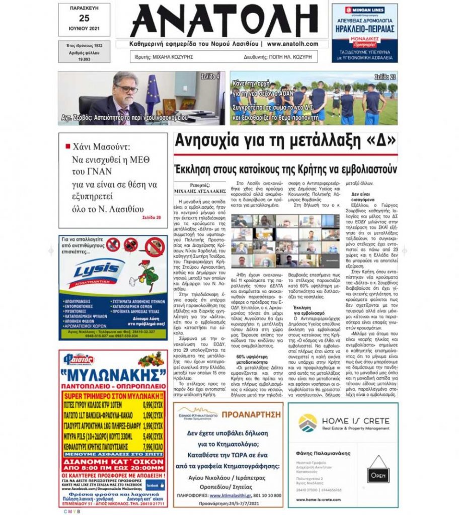 Πρωτοσέλιδο εφημερίδας “Ανατολή” 25/6/2021