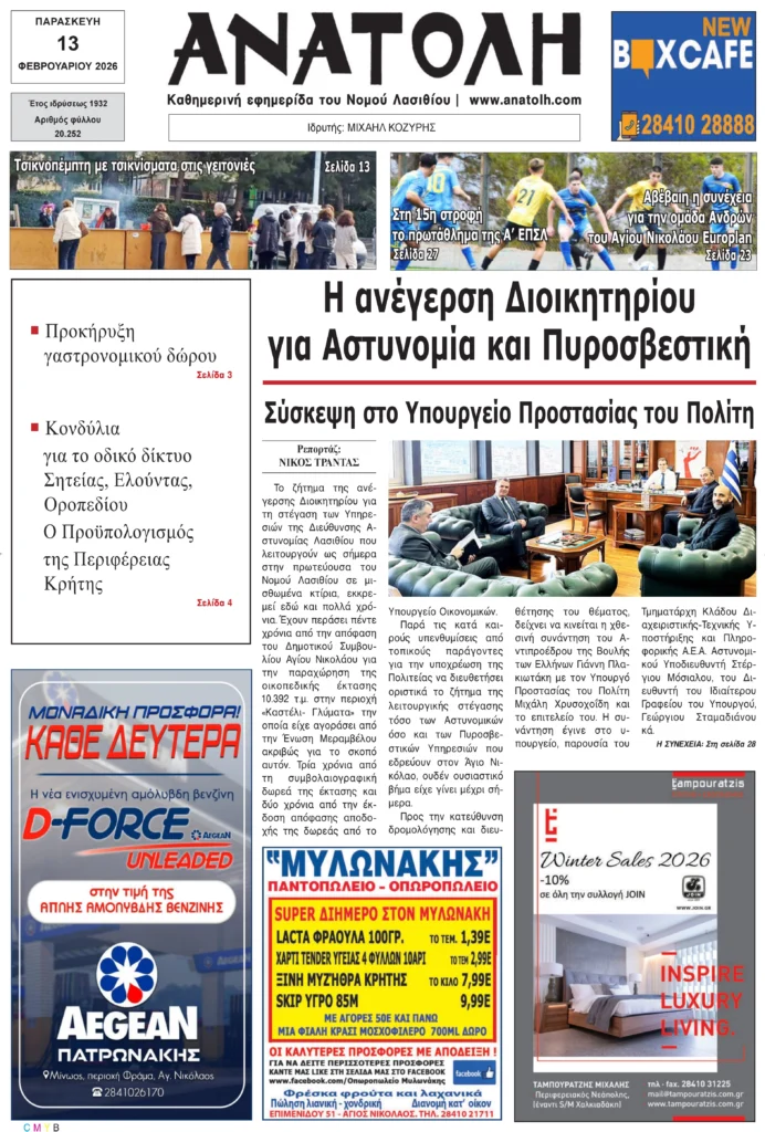 Πρωτοσέλιδο εφημερίδας “Νέα Κρήτη” 13/2/2026