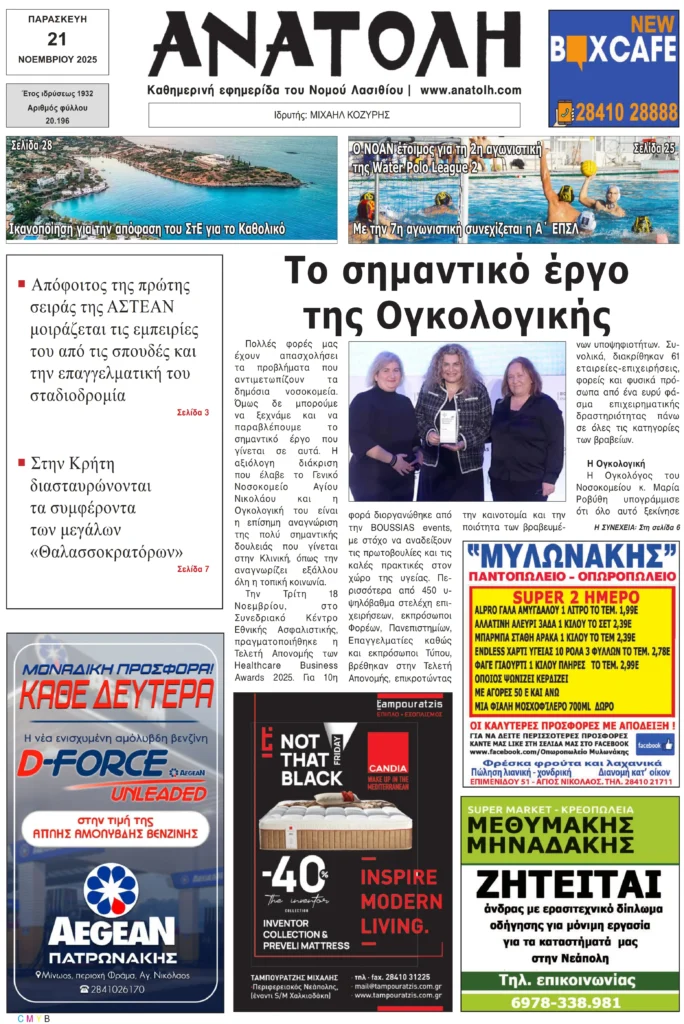 Πρωτοσέλιδο εφημερίδας “Ανατολή” 21/11/2025