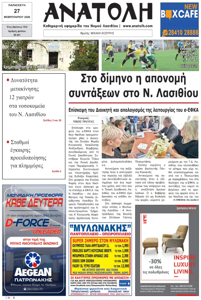 Πρωτοσέλιδο εφημερίδας “Ανατολή” 27/2/2026