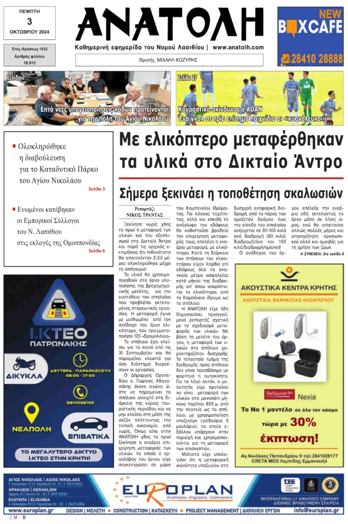 Πρωτοσέλιδο εφημερίδας “Ανατολή” 3/10/2024