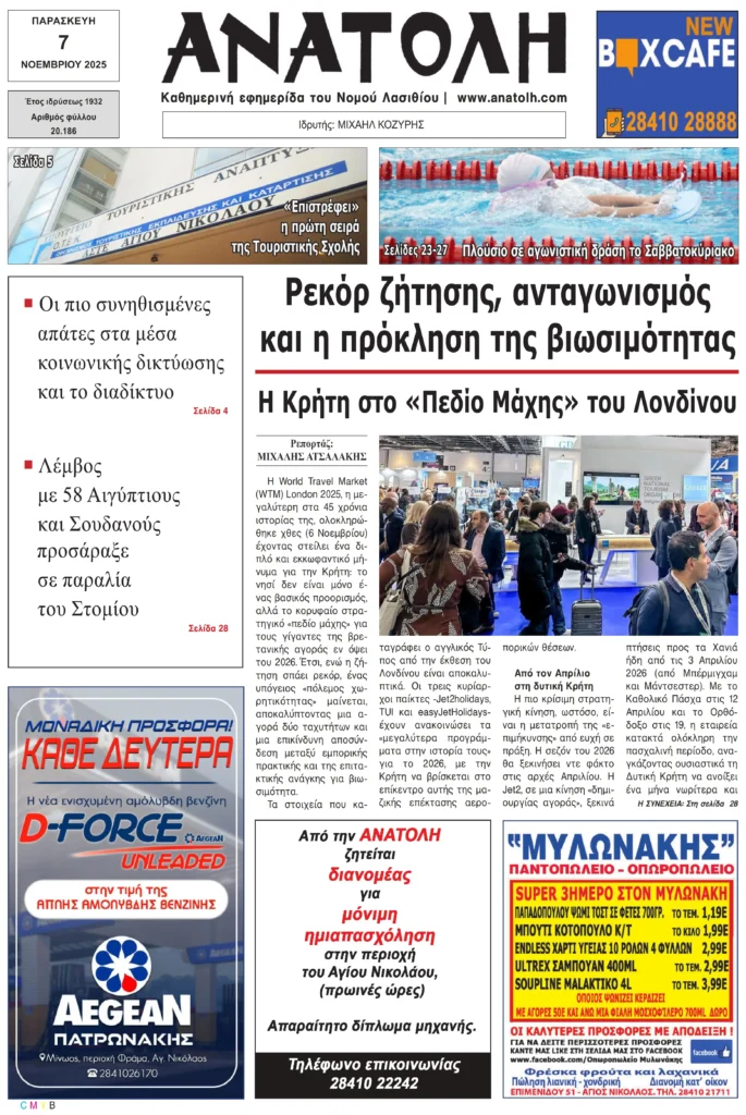 Πρωτοσέλιδο εφημερίδας “Ανατολή” 7/11/2025