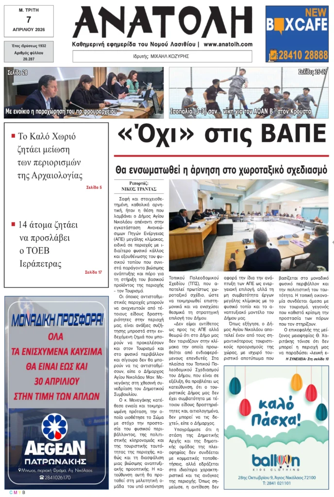 Πρωτοσέλιδο εφημερίδας “Ανατολή” 7/4/2026