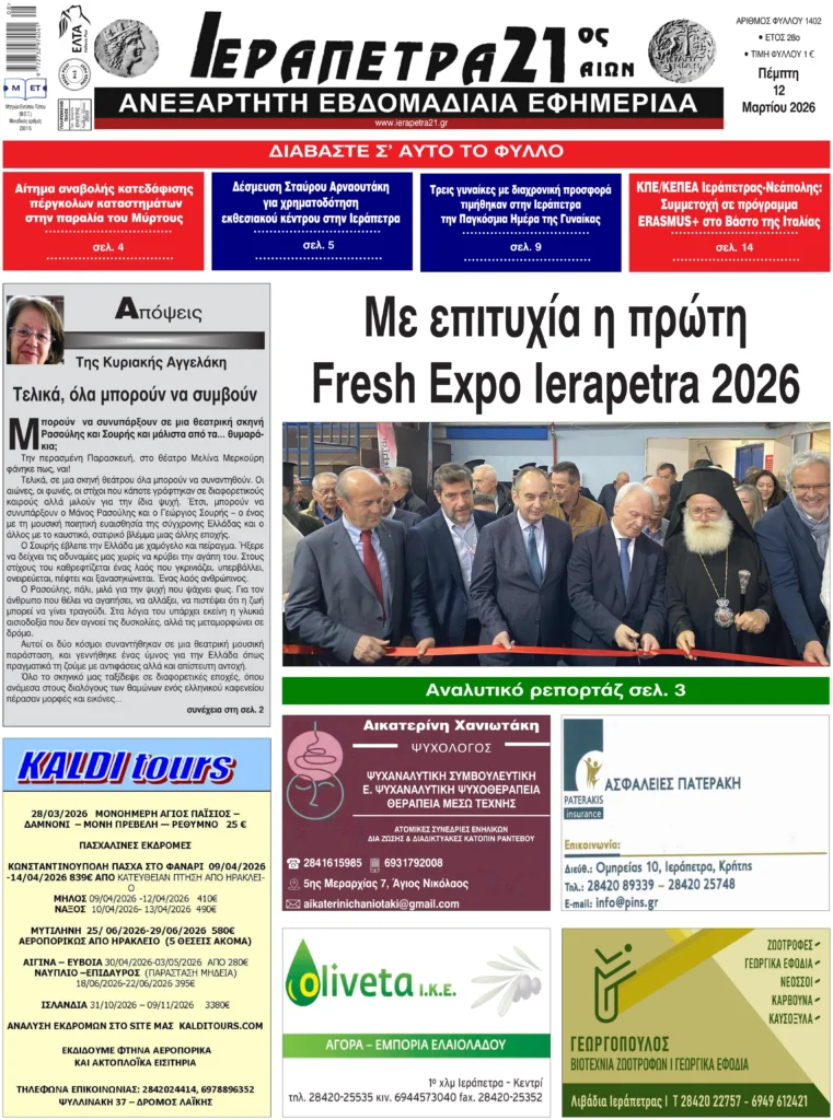 Πρωτοσέλιδο εφημερίδας “Ιεράπετρα 21ος Αιών” 12/3/2026