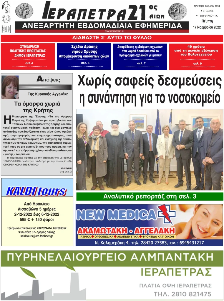 Πρωτοσέλιδο εφημερίδας “Ιεράπετρα 21ος Αιών” 17/11/2022