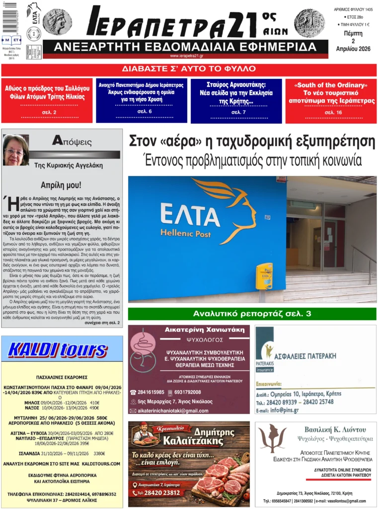 Πρωτοσέλιδο εφημερίδας “Ιεράπετρα 21ος Αιών” 2/4/2026