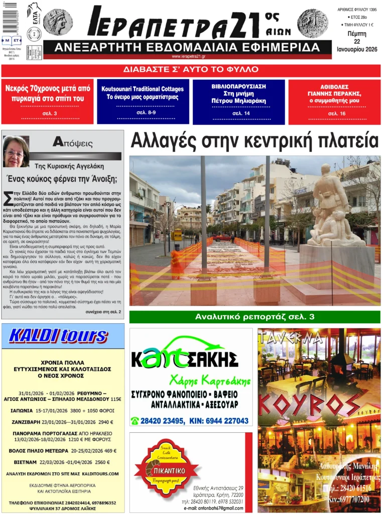Πρωτοσέλιδο εφημερίδας “Ιεράπετρα 21ος Αιών” 22/1/2026