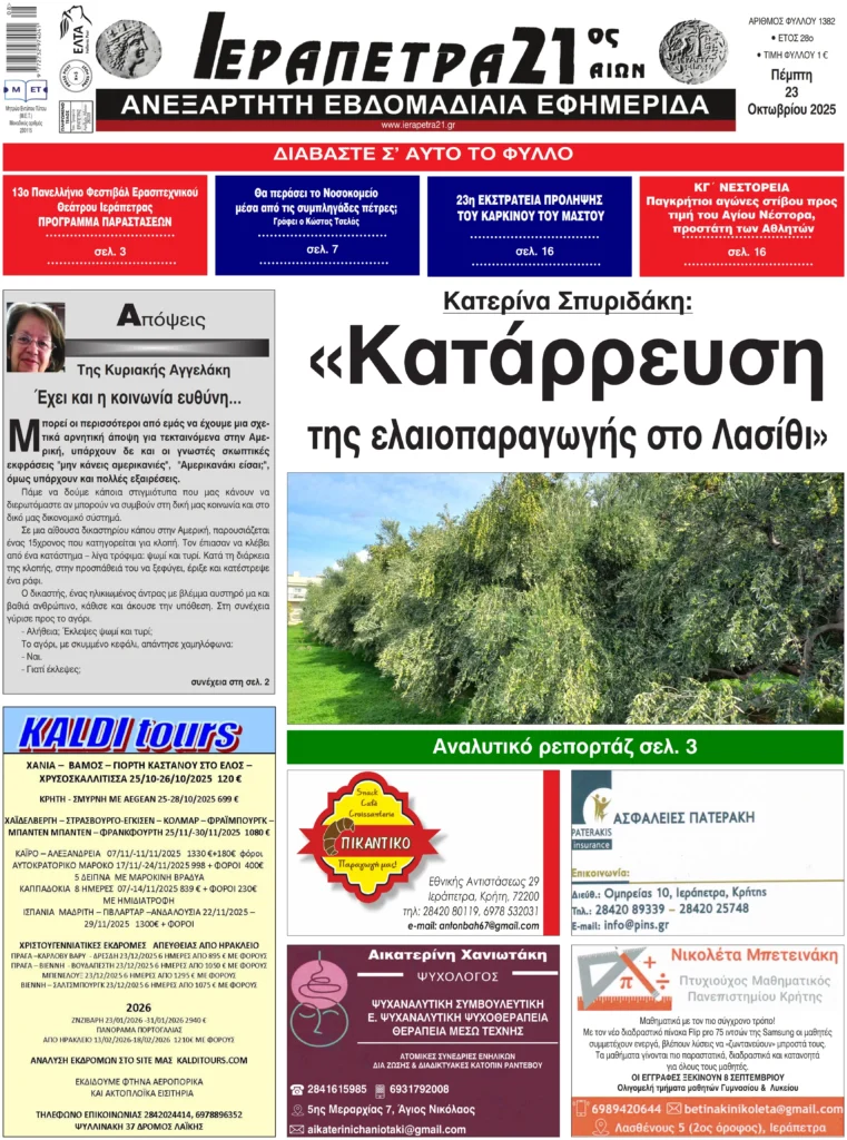 Πρωτοσέλιδο εφημερίδας “Ιεράπετρα 21ος Αιών” 23/10/2025