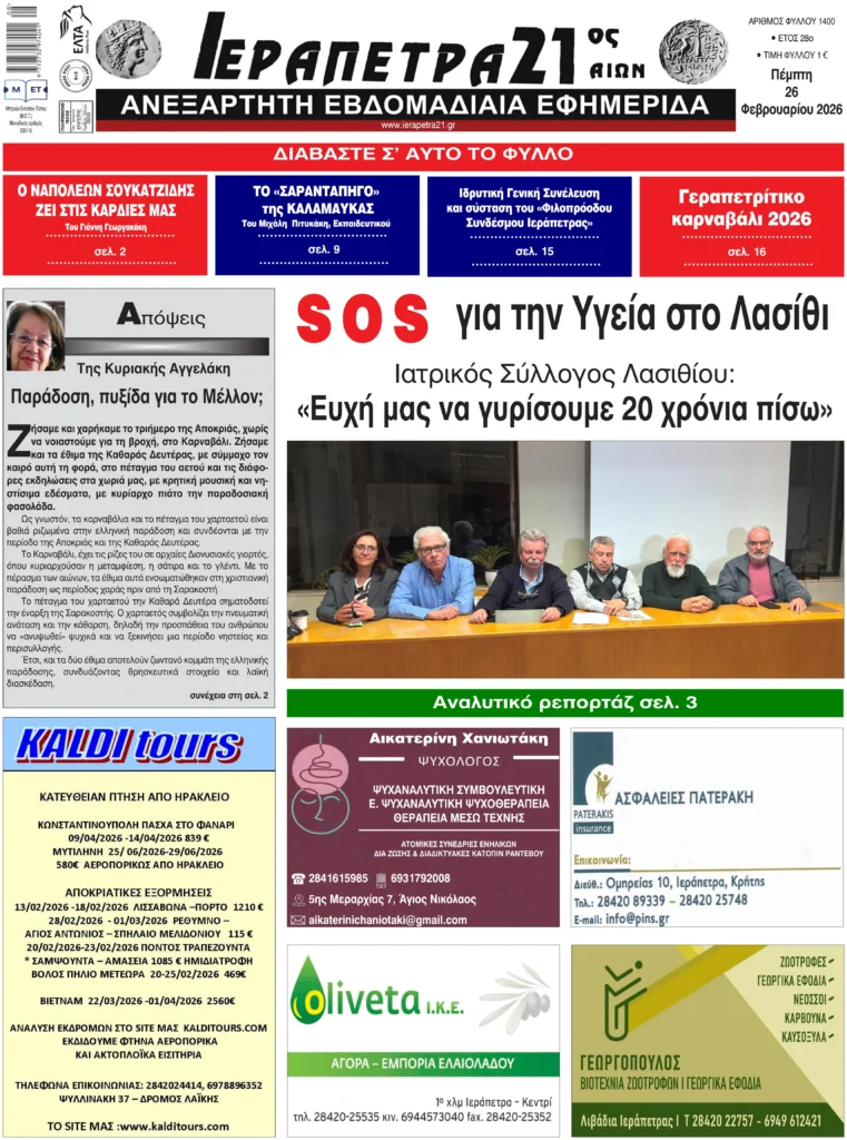 Πρωτοσέλιδο εφημερίδας “Ιεράπετρα 21ος Αιών” 26/2/2026