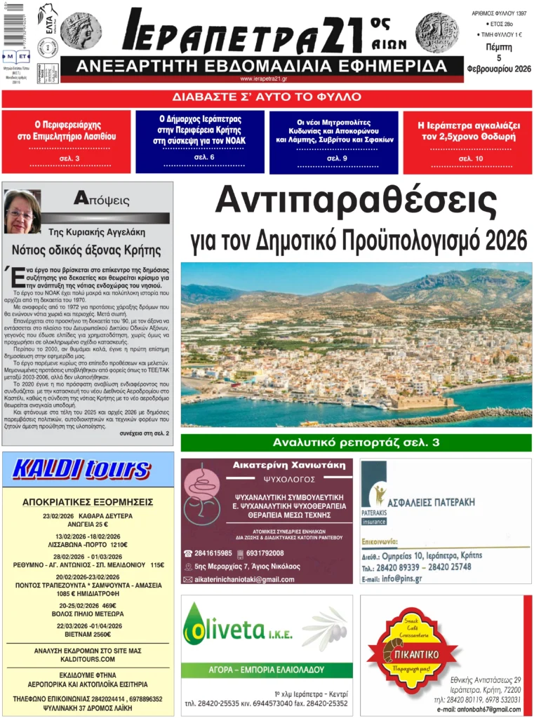 Πρωτοσέλιδο εφημερίδας “Ιεράπετρα 21ος Αιών” 5/2/2026