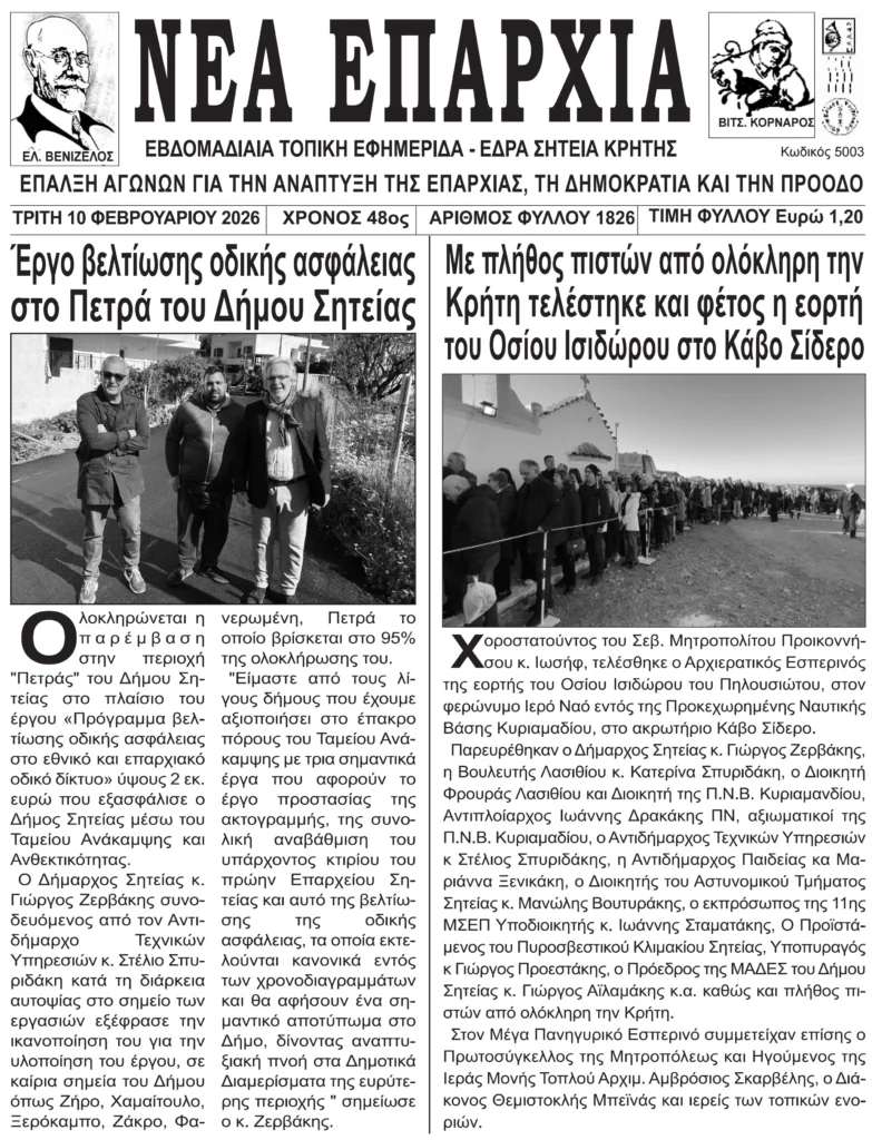 Πρωτοσέλιδο εφημερίδας “Νέα Κρήτη” 13/2/2026