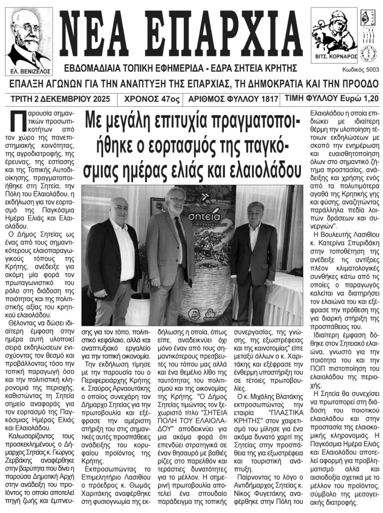 Πρωτοσέλιδο εφημερίδας “Ιεράπετρα 21ος Αιών” 4/12/2025