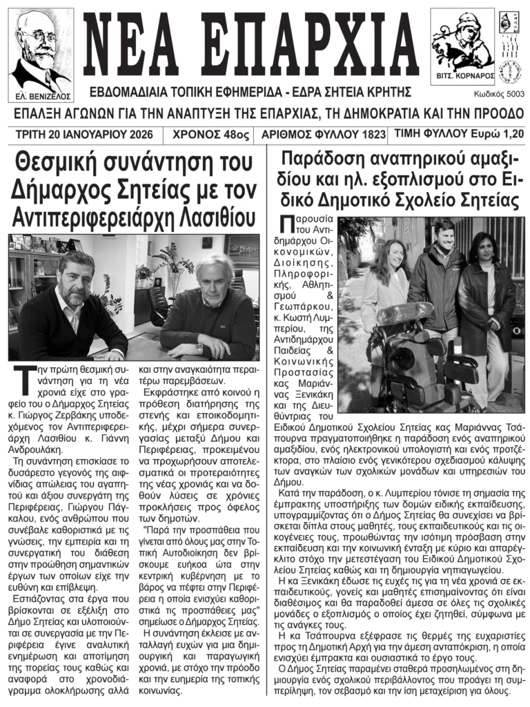 Πρωτοσέλιδο εφημερίδας “Ιεράπετρα 21ος Αιών” 22/1/2026