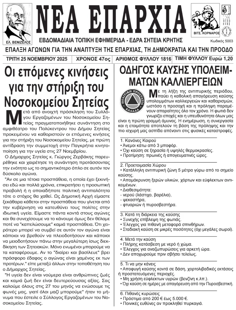 Πρωτοσέλιδο εφημερίδας “Νέα Επαρχία” 25/11/2025
