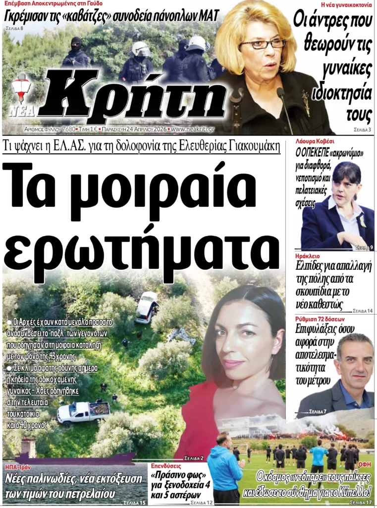 Πρωτοσέλιδο εφημερίδας “Νέα Κρήτη” 24/4/2026