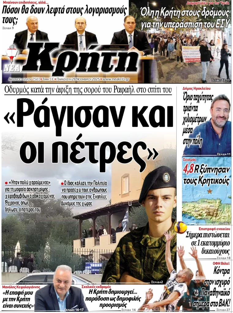 Πρωτοσέλιδο εφημερίδας “Νέα Κρήτη” 28/11/2025