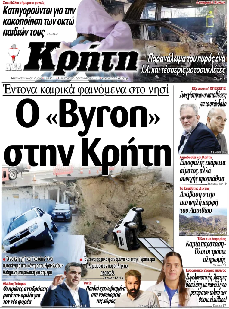 Πρωτοσέλιδο εφημερίδας “Νέα Κρήτη” 5/12/2025