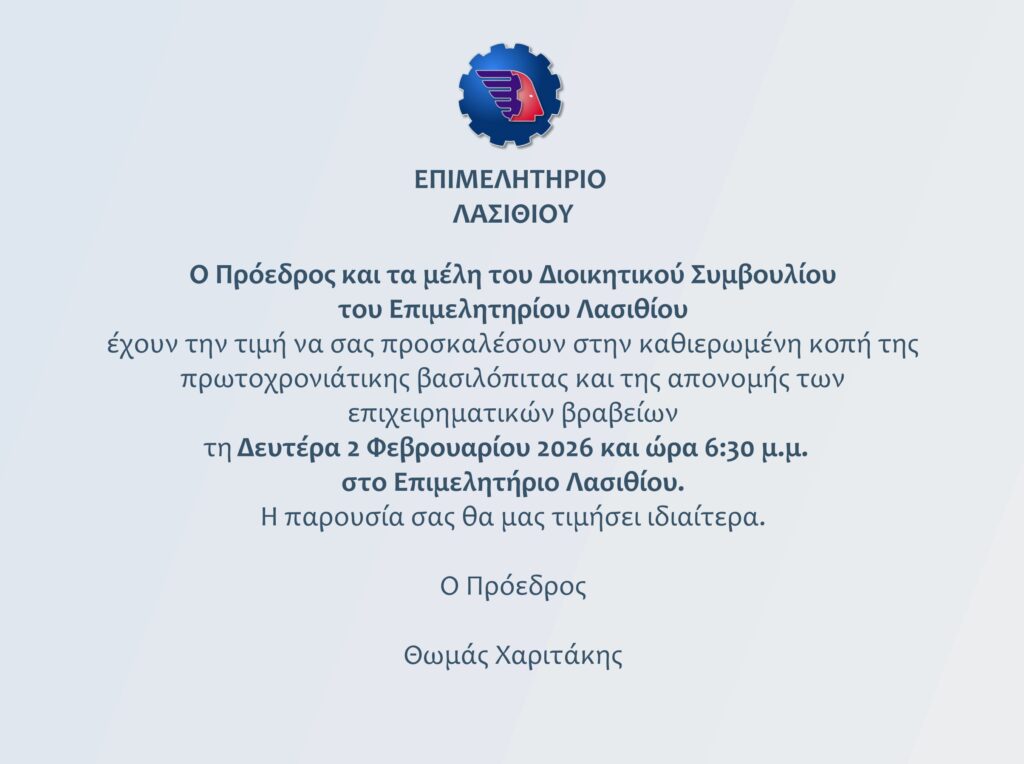 Πρόσκληση στην Εκδήλωση Κοπής Πίτας και Απονομή Βραβείων από το Επιμελητήριο Λασιθίου 2/2/2026 στις 6:30μμ 0 By LCCI on 30.01.2026 Γενικα
